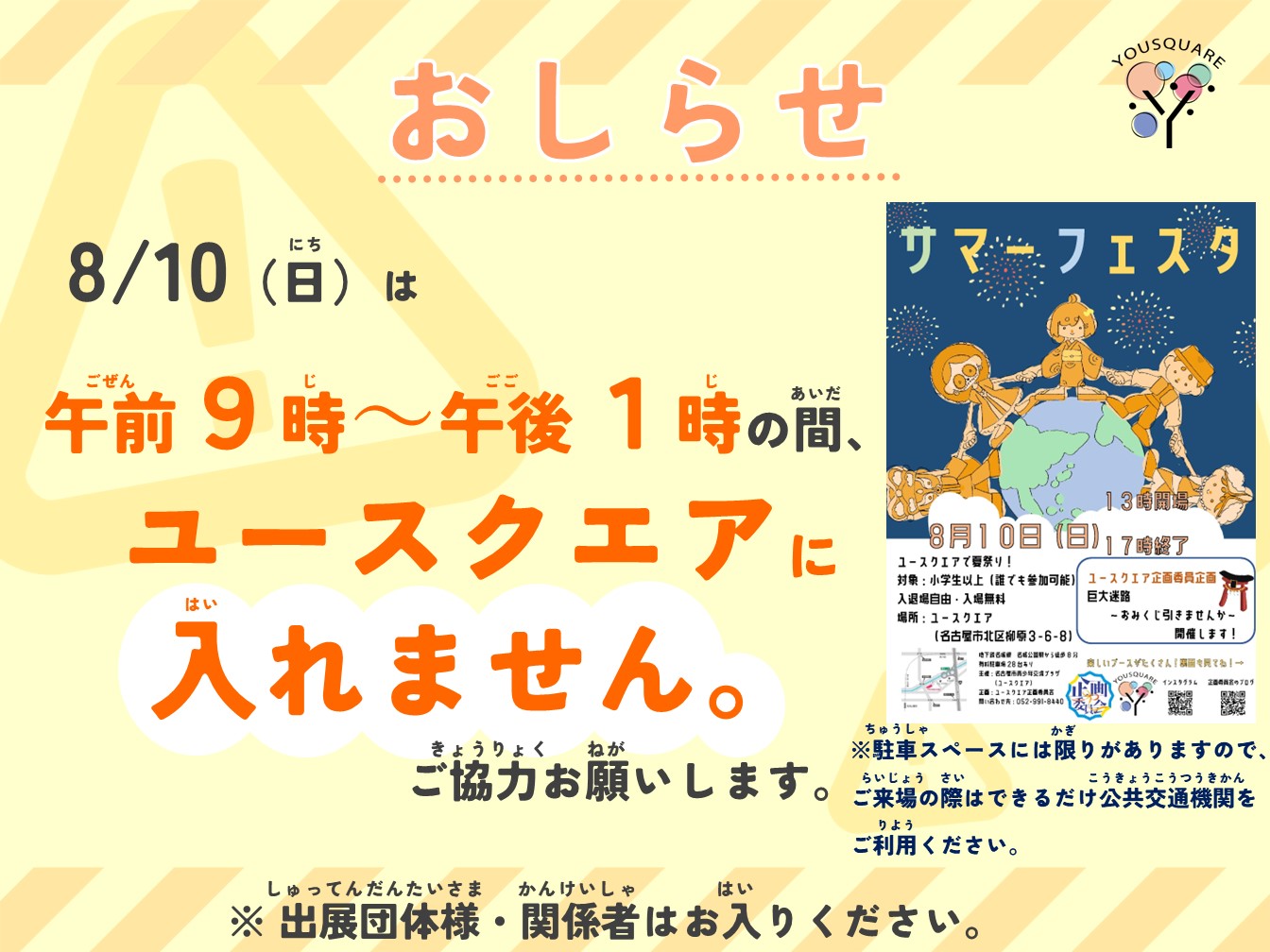 おしらせ📣【8/10(日)ユースクエアご利用案内】