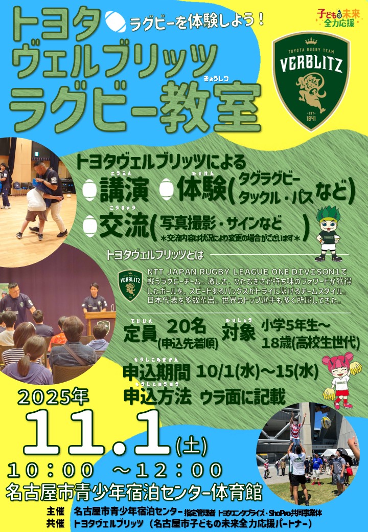 当日は、タグラグビーやタックル、パスなどのラグビー体験をはじめ、プロの選手たちによるお話や、写真撮影・サインなどの交流タイムもあります。