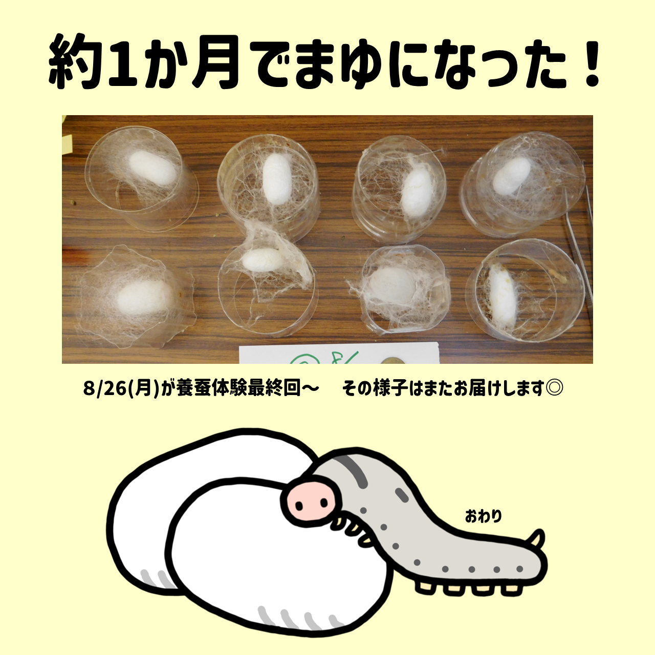 今度は8/26(月)の養蚕体験最終回についてお届けしますね💌