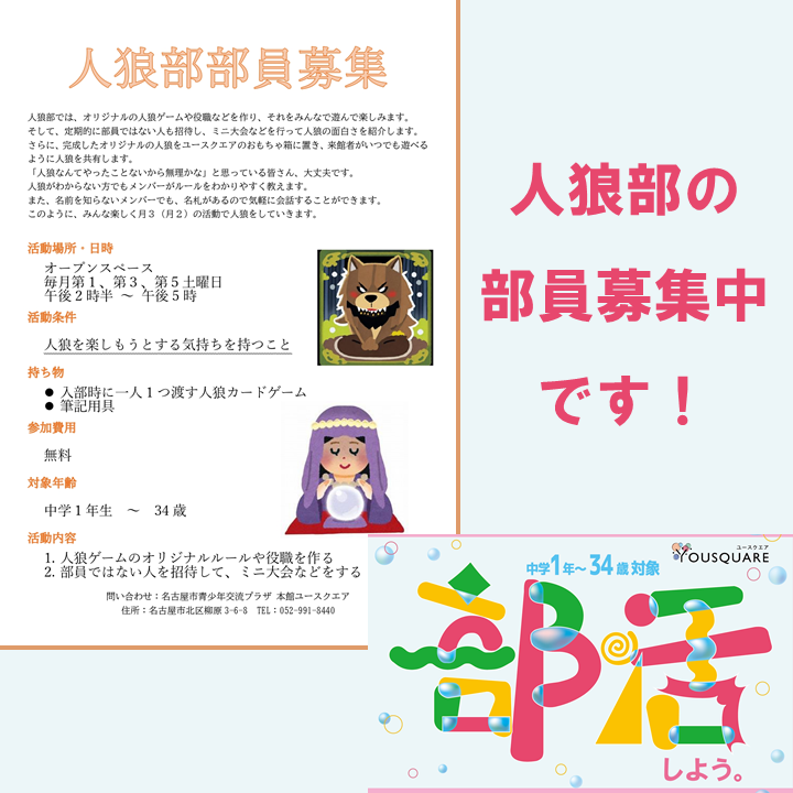 人狼部がゲームマスターになって運営します🔥 また今回、企画・運営を行う人狼部は部員募集中です! 気軽にお問い合わせくださいね~