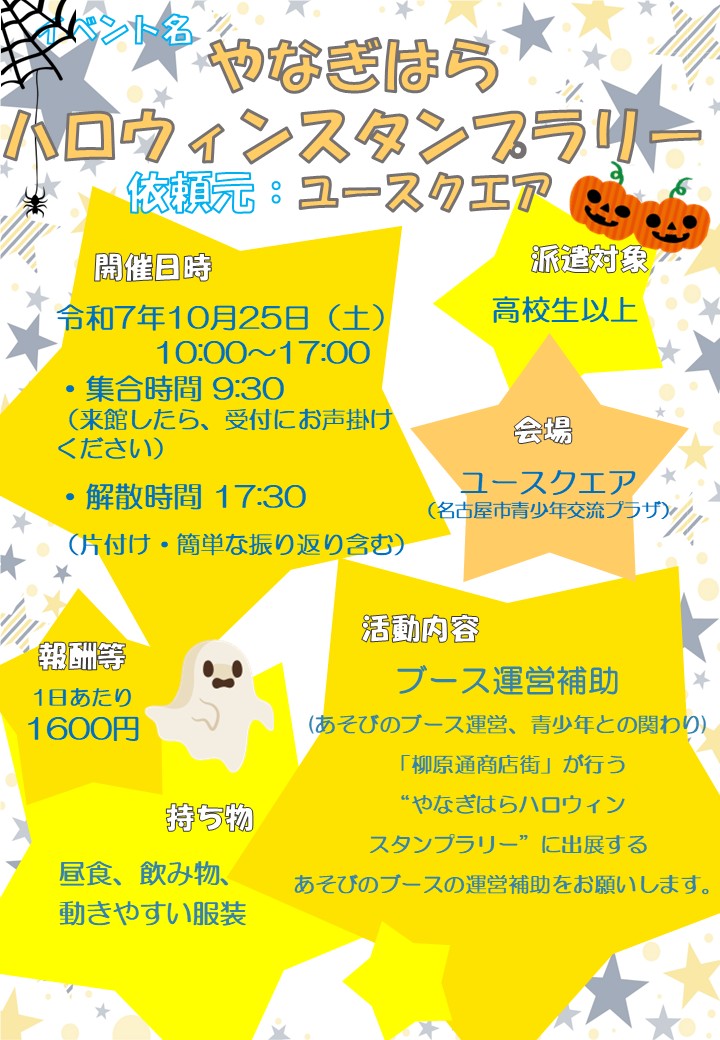 【ボランティア募集】『10/25(土)✨やなぎはらハロウィンスタンプラリーinユースクエア🎃』